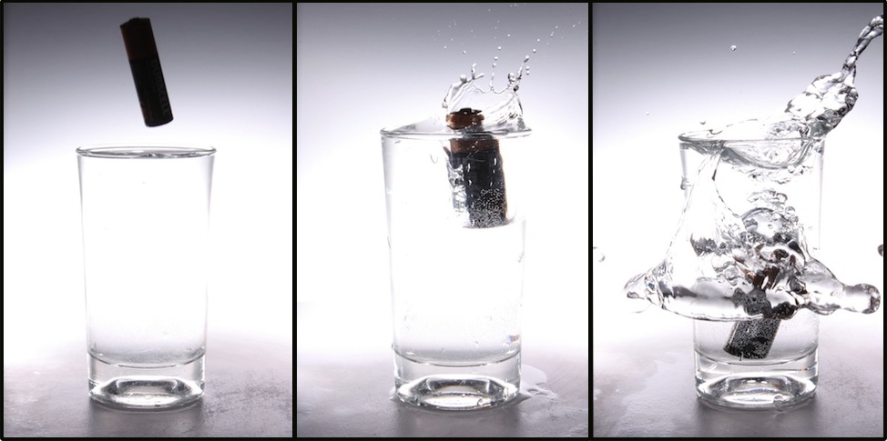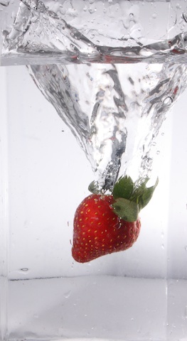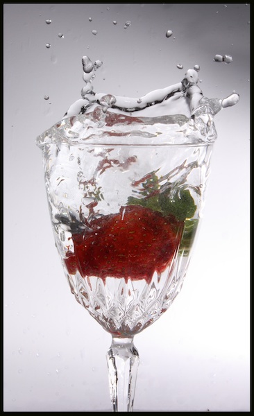 First, I tried using a battery in a glass of water. I thought that the long shape of the battery would make a really interesting shape when it splashed. However, I was not very happy with my results. The battery itself was not well-lit enough. So, I tried again a few days later with strawberries: